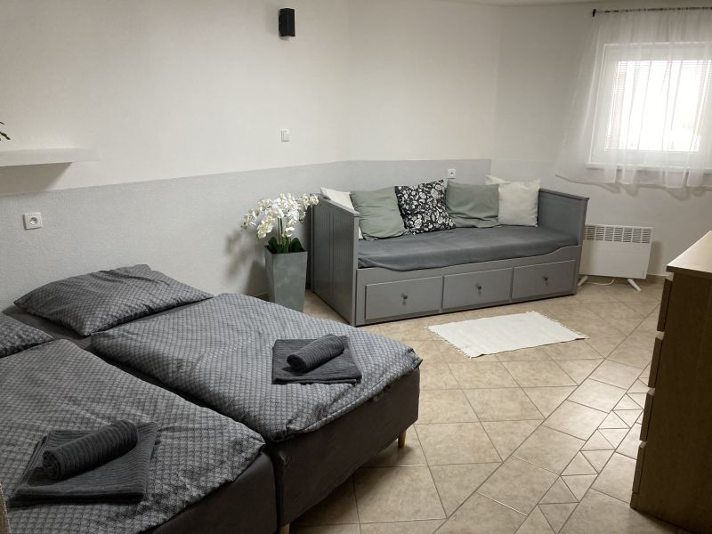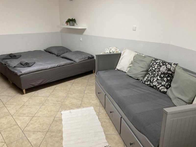 1x manželská postel (s možností odsunutí postelí), 1x rozkladací postel (160x200cm), 1x přistýlka (130x200cm)